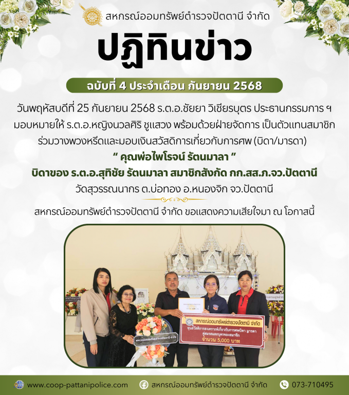 วันพฤหัสบดีที่ 25 กันยายน 2568 ร.ต.อ.ชัยยา วิเชียรบุตร ประธานกรรมการ ฯ มอบหมายให้ ร.ต.อ.หญิงนวลศิริ ชูแสวง พร้อมด้วยฝ่ายจัดการ เป็นตัวแทนสมาชิกร่วมวางพวงหรีดและมอบเงินสวัสดิการเกี่ยวกับการศพ (บิดา/มารดา) คุณพ่อไพโรจน์ รัตนมาลา บิดาของ ร.ต.อ.สุทิชัย รัตนมาลา สมาชิกสังกัด กก.สส.ภ.จว.ปัตตานี วัดสุวรรณนากร ต.บ่อทอง อ.หนองจิก จว.ปัตตานี
