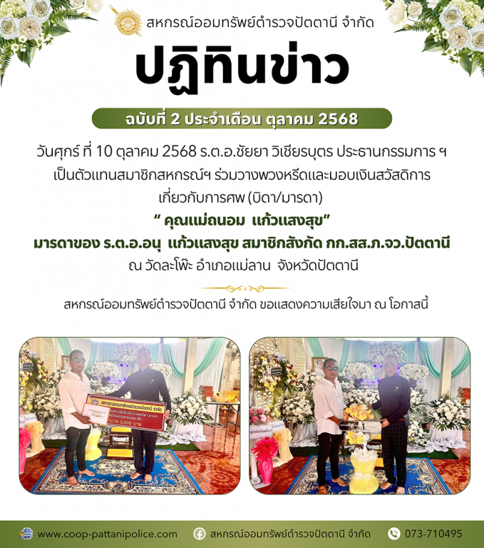 วันศุกร์ ที่ 10 ตุลาคม 2568 ร.ต.อ.ชัยยา วิเชียรบุตร ประธานกรรมการ ฯ เป็นตัวแทนสมาชิกสหกรณ์ฯ ร่วมวางพวงหรีดและมอบเงินสวัสดิการเกี่ยวกับการศพ (บิดา/มารดา) “คุณแม่ถนอม แก้วแสงสุข” มารดาของ ร.ต.อ.อนุ แก้วแสงสุข สมาชิกสังกัด กก.สส.ภ.จว.ปัตตานี ณ วัดละโพ๊ะ อำเภอแม่ลาน จังหวัดปัตตานี