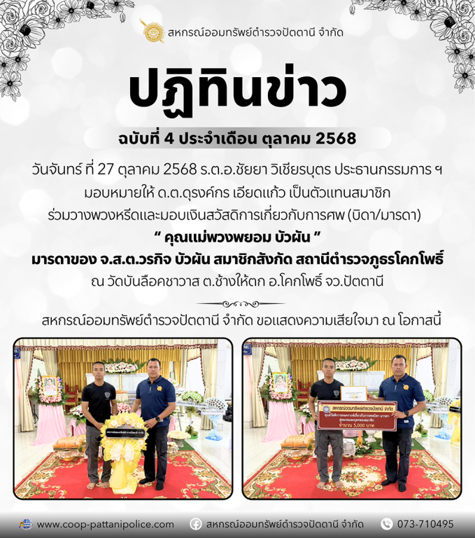 วันจันทร์ ที่ 27 ตุลาคม 2568 ร.ต.อ.ชัยยา วิเชียรบุตร ประธานกรรมการ ฯ มอบหมายให้ ด.ต.ดุรงค์กร เอียดแก้ว เป็นตัวแทนสมาชิก ร่วมวางพวงหรีดและมอบเงินสวัสดิการเกี่ยวกับการศพ (บิดา/มารดา) “ คุณแม่พวงพยอม บัวผัน ” มารดาของ จ.ส.ต.วรกิจ บัวผัน สมาชิกสังกัด สถานีตำรวจภูธรโคกโพธิ์ ณ วัดบันลือคชาวาส ต.ช้างให้ตก อ.โคกโพธิ์ จว.ปัตตานี