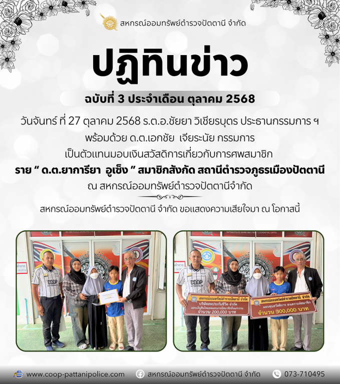 วันจันทร์ ที่ 27 ตุลาคม 2568 ร.ต.อ.ชัยยา วิเชียรบุตร ประธานกรรมการ ฯ พร้อมด้วย ด.ต.เอกชัย เจียระนัย กรรมการ เป็นตัวแทนมอบเงินสวัสดิการเกี่ยวกับการศพสมาชิก ราย “ ด.ต.ยาการียา อูเซ็ง ” สมาชิกสังกัด สถานีตำรวจภูธรเมืองปัตตานี ณ สหกรณ์ออมทรัพย์ตำรวจปัตตานีจำกัด