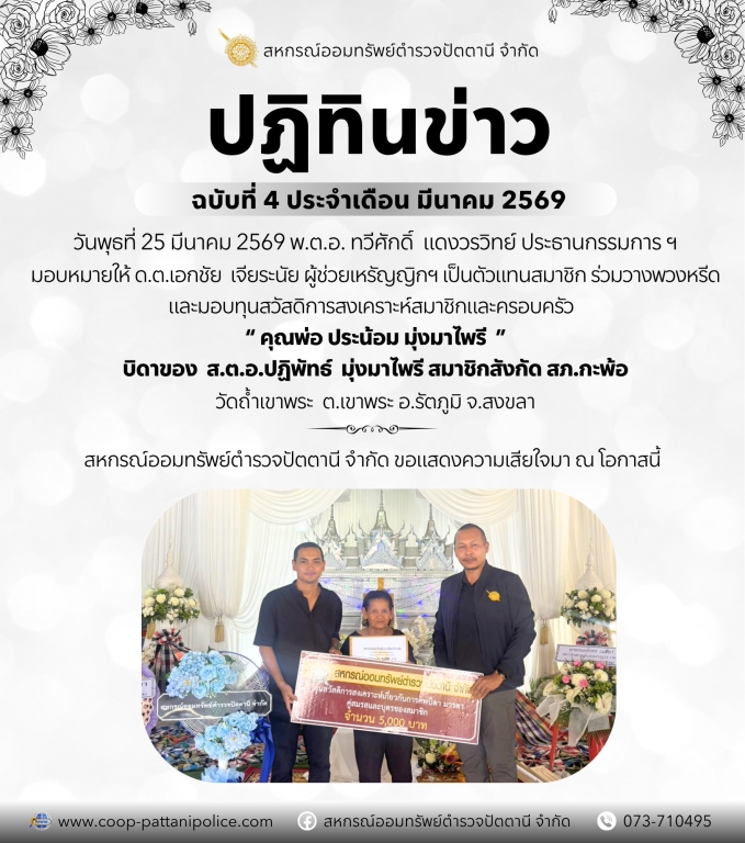 วันพุธที่ 25 มีนาคม 2569 พ.ต.อ. ทวีศักดิ์ แดงวรวิทย์ ประธานกรรมการ ฯ มอบหมายให้ ด.ต.เอกชัย เจียระนัย ผู้ช่วยเหรัญญิกฯ เป็นตัวแทนสมาชิก ร่วมวางพวงหรีด และมอบทุนสวัสดิการสงเคราะห์สมาชิกและครอบครัว “ คุณพ่อ ประน้อม มุ่งมาไพรี ” บิดาของ ส.ต.อ.ปฏิพัทธ์ มุ่งมาไพรี สมาชิกสังกัด สภ.กะพ้อ วัดถ้ำเขาพระ ต.เขาพระ อ.รัตภูมิ จ.สงขลา